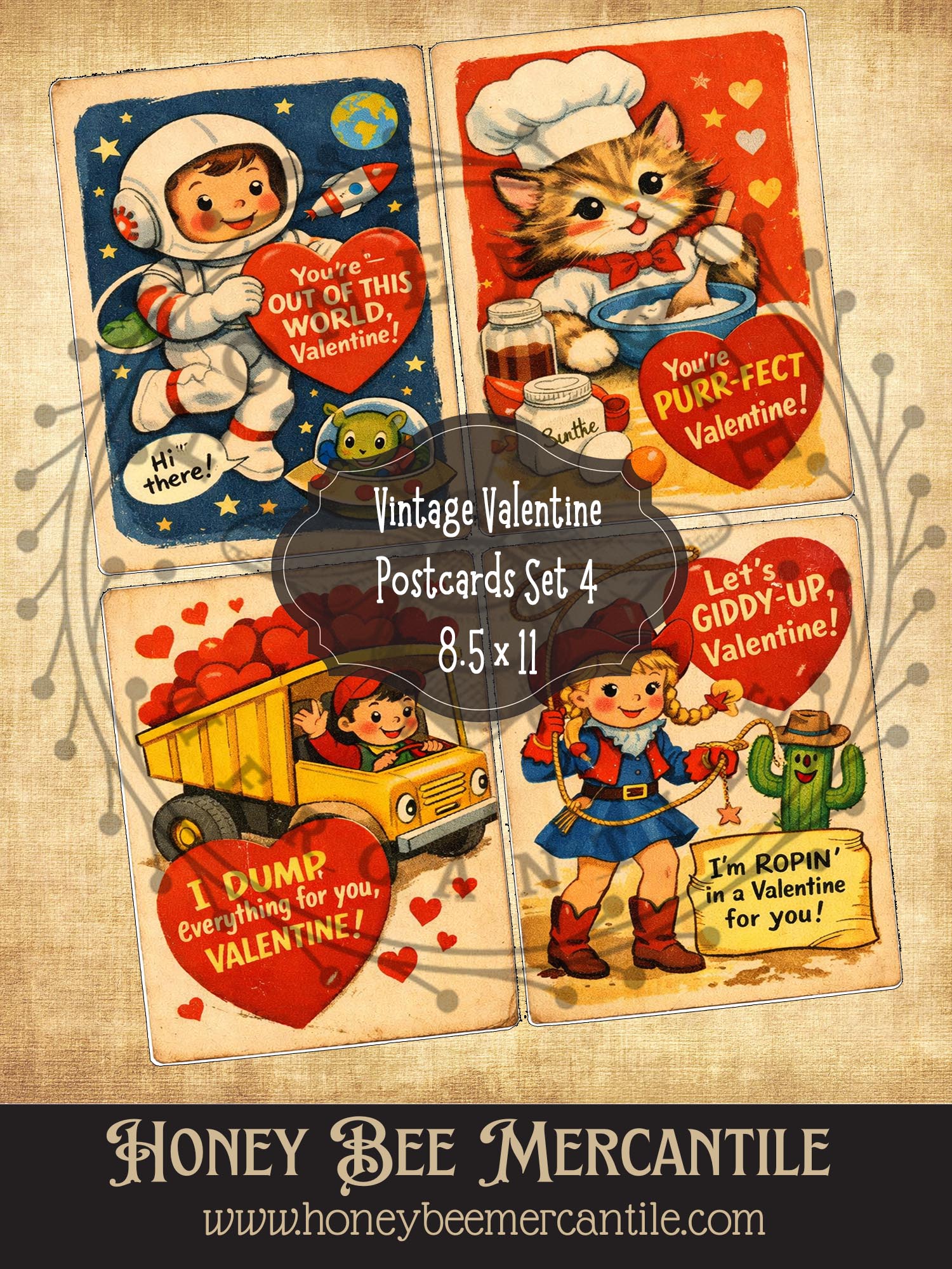 RICE PAPER PRINT 4x5 Vintage Valentine Postcards, Craft Supplies, Decoupage, Folk-art, Set of 4, Set 4